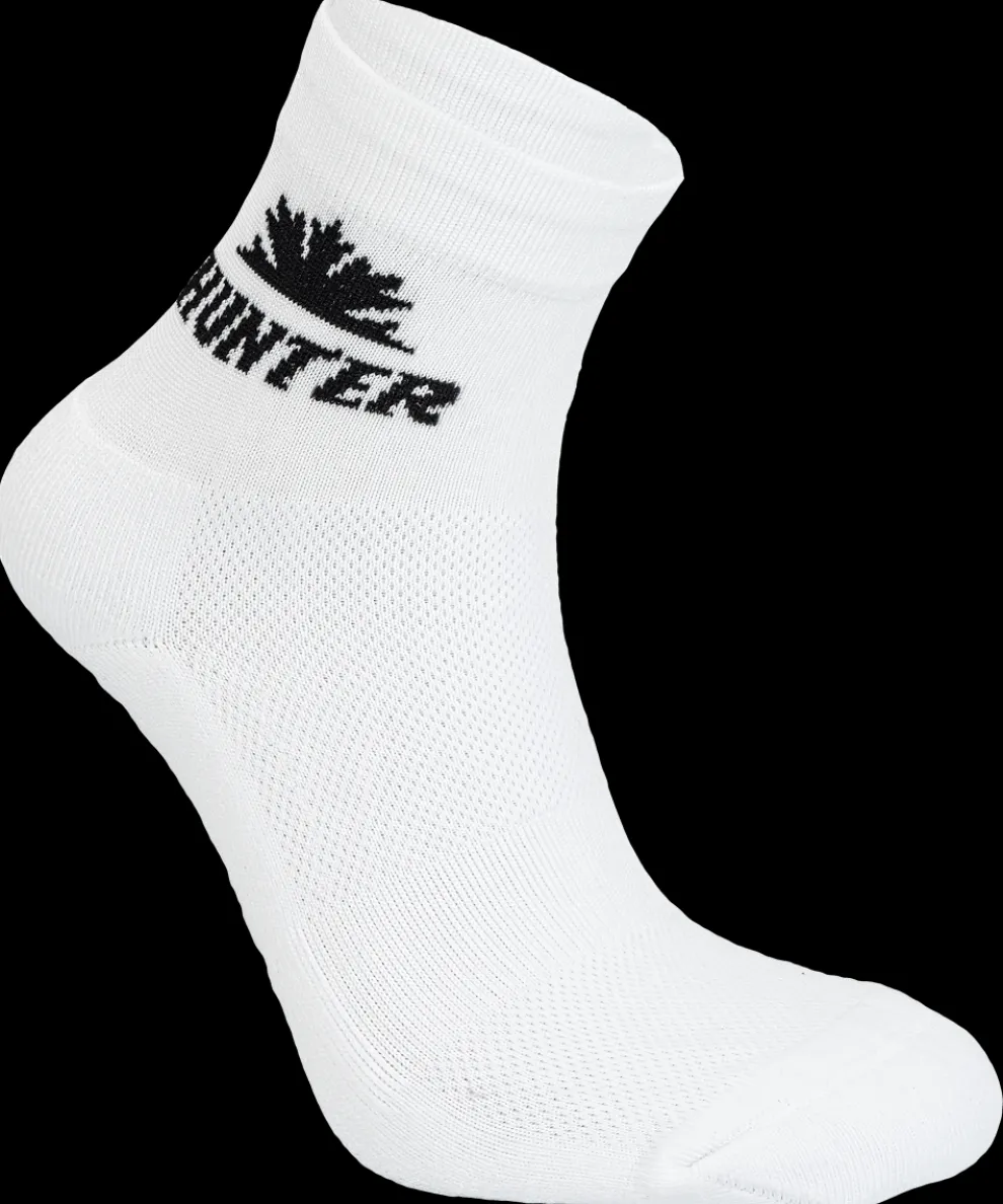 Hunter sokken in hol polypropyleen materiaal is een vooruitstrevend product binnen de fietswereld. Dit materiaal is antibacterieel, extreem zacht en ademend. De karaktereigenschappen van het materiaal zijn ideaal om te voldoen aan de eisen van de fietser en schaatser. Tijdens lichamelijke beweging kan een voet veel zweet produceren en het is belangrijk dat de vezel, in contact met de huid, dit snel af kan voeren naar de volgende lagen. Dankzij de bijzondere moleculaire structuur van de vezel kan het zweet sneller afgevoerd worden dan bijvoorbeeld door polyester en polyamide, terwijl de huid droog blijft. Hunter sokken zijn in het bijzonder geschikt voor intensief gebruik.