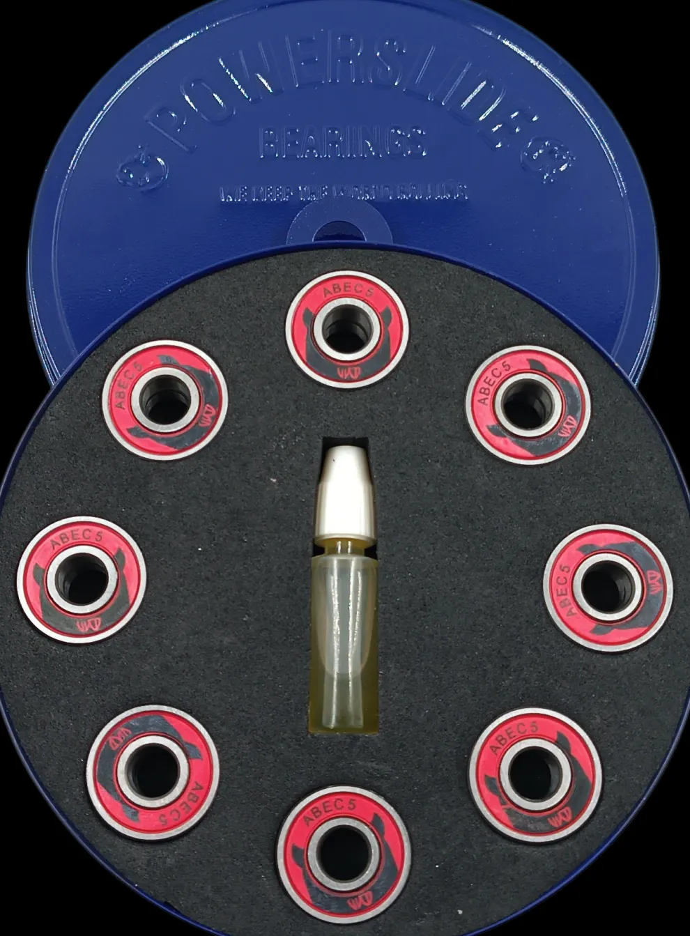 16 Powerslide Wicked lagers in een mooi blikje, samen met een flesje lagerolie.