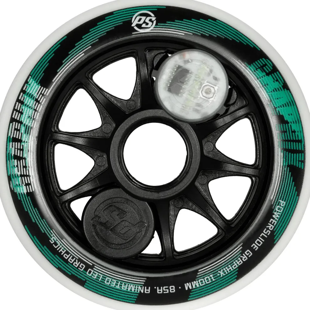 De toekomst is nu, en de toekomst is rooskleurig. Deze nieuwe Powerslide Graphix 100 witte LED-wielen zullen uw rit verlichten, maar alleen wanneer u dat wilt. Schakel de verlichting eenvoudig aan en uit door op de LED-module te drukken, die in de speciaal ontworpen Graphix-kern is geklikt. De batterij is oplaadbaar dankzij de micro-USB-poort (kabel niet meegeleverd). Vergeet standaard LED-wielen die langzaam draaien vanwege de hoge magnetische rolweerstand. Graphix-wielen scoren hoog met hun uitstekende uiterlijk en topprestaties. Dit wiel heeft een diameter van 100 mm en een hardheid van 85A. Het is helderwit en toont meerdere, veranderende afbeeldingen en teksten. Sluit u nu aan bij de Graphix-revolutie.
